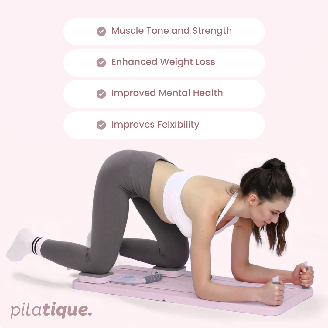 Pilatique brings studio quality Pilates into your home with a compact, joint-friendly board engineered for total-body results. Build lean muscle and core strength, support healthy weight loss through low-impact training, boost mental well-being with mindful movement, and unlock fluid flexibility.